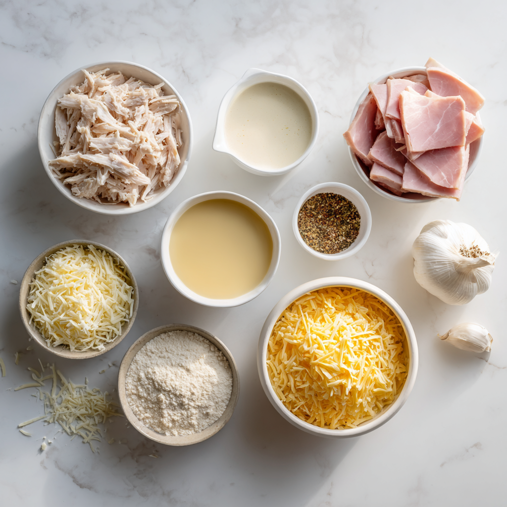 - In a large mixing bowl, combine the shredded chicken, sliced ham, Swiss cheese, cream of chicken soup, milk, garlic powder, paprika, salt, and pepper.