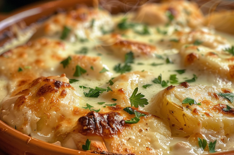 Some nights call for a salad. Others demand Creamy Garlic Chicken & Potato Bake with Melted Cheese. This is the latter. It’s the kind of dish that makes the kitchen smell like heaven and forces everyone to the table before you’ve even set down the trivets. We’re talking tender, shredded chicken and thin slices of potato swimming in a garlic-infused cream sauce, all capped with a lid of sharp cheddar and Parmesan.
