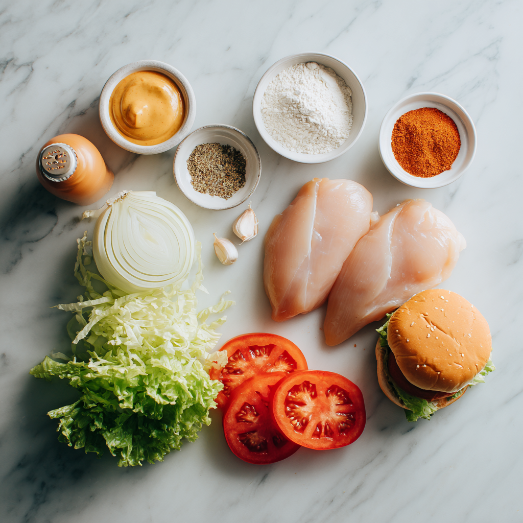 - Assemble the sandwich with chicken, shredded lettuce, and sliced tomatoes.