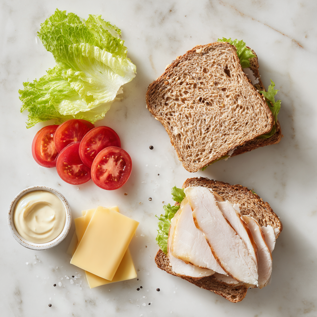 Whole grain bread adds fiber and nutrients, making this sandwich more filling and nutritious compared to white bread. - 4 oz sliced turkey breast